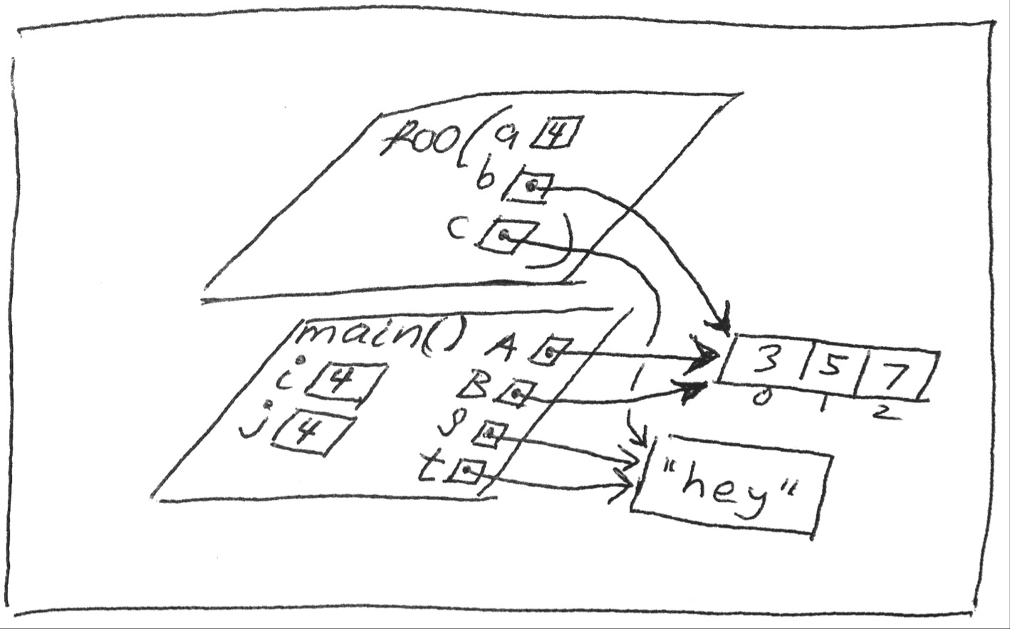 Important! Now, here's the truly important thing to know: values of a primitive type are basically the same as in C++; picture a box with the value written in the box. Assignment copies the contents of the right-hand side box into the left-hand side box. Function arguments are passed by value, just as they are by default in C++. Variables referring to arrays and class objects work similar to pointers in C++ (although they are called references in Java and are used differently as we'll see later); picture a little box with an arrow pointing to the box that actually has values written inside.