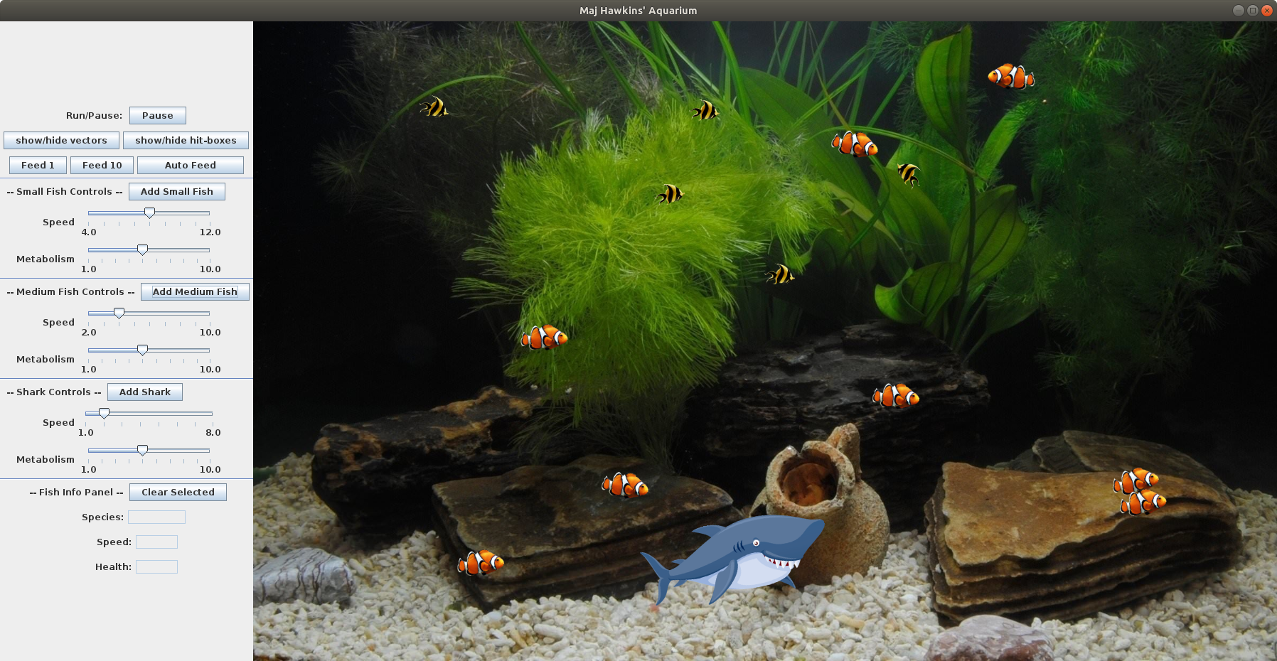 As time goes on, health slowly decreases. The higher the metabolism of a fish, the faster its health decreases, therefore a fish/shark with a higher metabolism must eat more often to stay alive. Fish and sharks die when their health reaches zero. (The metabolism of a fish can be fixed initially, but is chosen by the user on the control panel as described in Part 5 below.)