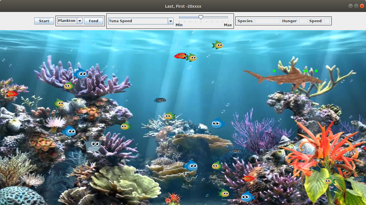 To showcase your OOP design principles, you are writing an Aquarium GUI that simulates the life cycles of at least four species of animals: phytoplankton, two types of fish, and sharks. The fish and sharks must eat to survive and die if they aren't fed in a specified time. Fish eat plankton. Sharks eat fish.