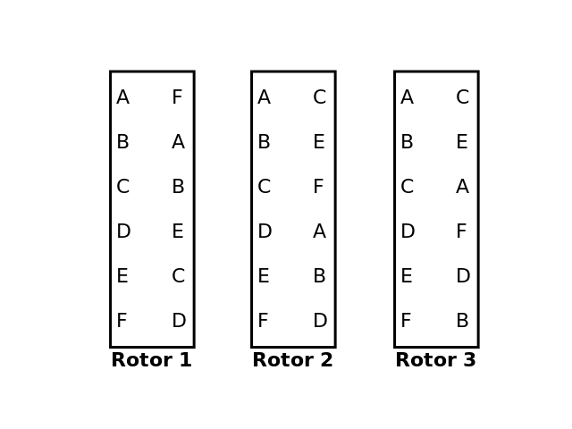 Enigma machines used interchangeable rotors that could be placed in different orientations to obtain different substitution patterns. More significantly, the rotors rotated after each character was encoded, changing the substitution pattern and making the code very difficult to break. For examples, let's pretend there are only six letters in the alphabet, and we have the three rotors below.