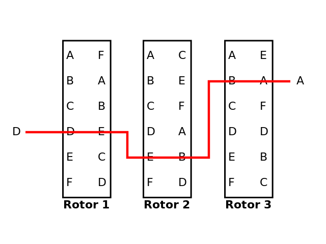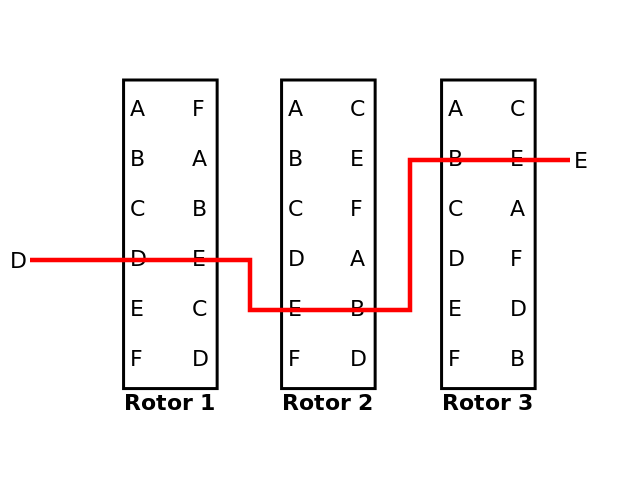 At this point, it may seem that this is just a substitution cypher, just an unnecessarily complex one. Well, after encrypting this 'D', Rotor 3 is rotated one slot (in the below picture, notice how in the third rotor, 'A' no longer maps to 'C' - instead, it now maps to 'E', which is the letter 'B' used to map to. In other words, each letter in the right column has moved up one spot). So, when we encrypt 'D' again, we get a different encrypted character.