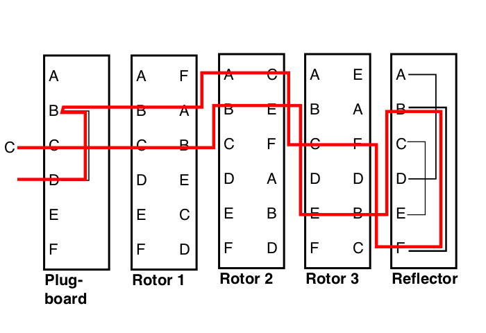 OK, fine, you say, so it's not a substitution cypher. But, because the rotor must eventually rotate all the way around again, it is just a Vigenere cypher with a key length of 6, and those are still vulnerable to a statistical attack. So here's the second twist... when that third rotor is rotating around to return to its original position (after the encryption of the 6th character), the second rotor rotates once as well, again changing the encryption. When the second rotor rotates all the way around, the first rotor clicks once, as well. So, the rotors don't return to their original position until you have typed 6^3 characters (26^3 if we're using a full alphabet). Essentially, this message has the same statistical properties as a one-time pad.