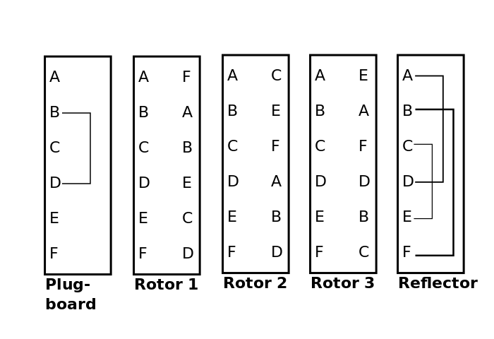 Finally, there was a reflector. The reflector was similar to the plugboard, in that letters were combined pairwise, but differed in that every letter has a partner. Additionally, once the reflector output a letter, that letter was fed back through the rotors and plugboard in reverse.