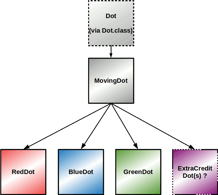 So what do you have to do? Well, even though you can't see the source code, the program Lab6 is written entirely as a Procedural Program. You will write it as an Object-Oriented Program using proper Encapsulation, Data Hiding, Inheritance, and Polymorphism! Once done, you will add some customized Dots to the program as well.