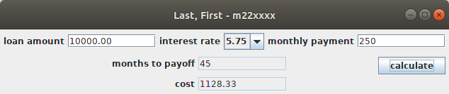 The idea here is that "loan amount", "rate" and "monthly payment" are inputs. The user enters or chooses values for them, then presses the calculate button, which causes the program to calculate values for "months to payoff" and "cost" and display them in the GUI.