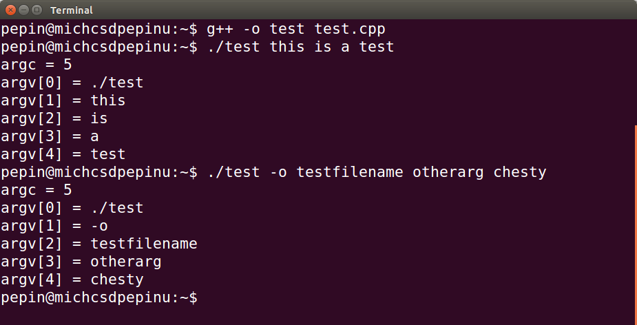 and have only the maximum printed out? That'd be kind of cool, and that'd be in the spirit of these Unix utilities we've been using. C++ has a mechanism for passing such command line arguments to main. You can define main with zero arguments, or you can define it with two arguments: and int and an array of c-style strings, i.e. char* []. The two arguments passed to main will be the number of strings the user typed when calling the program (which includes the program itself!), and an array of c-style strings that are each of the strings the user typed on the command line in calling the program. For example, the following test program reads in command line arguments: