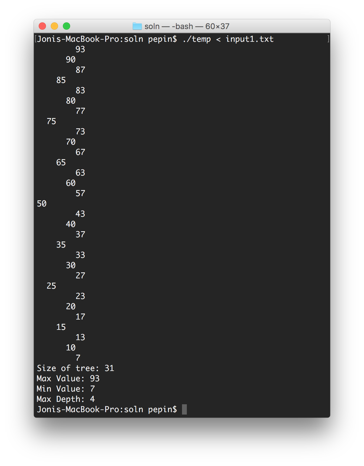 Notice how the values in the left subtree have changed based on the order elements were inserted into the Tree. The prettyPrint function (provided as part of TreeNode.h) can be used to verify proper tree placement when testing your solution. See the sample output below for what the Tree structure should look like when using the provided file input1.txt.