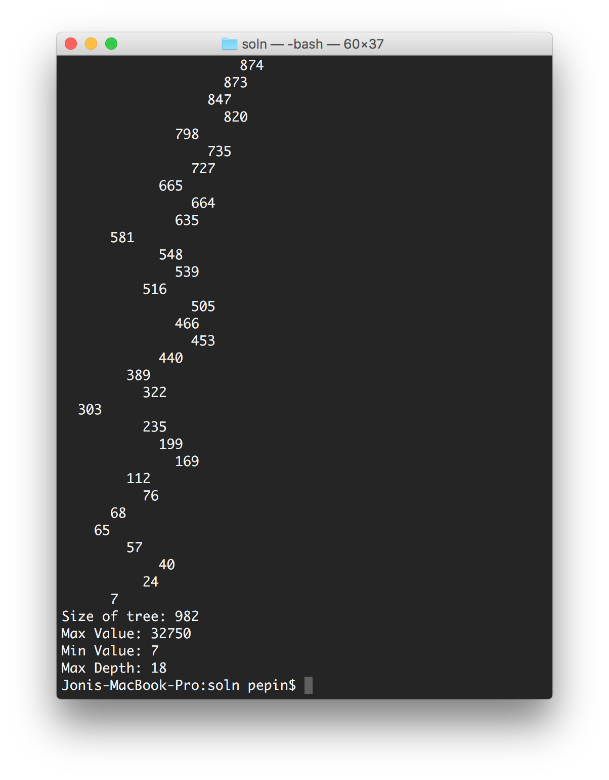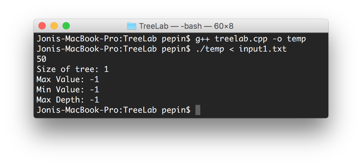 Notice that the Max Value, Min Value and Max Depth are -1. You'll fix that shortly. Now that you've confirmed the program works, you can be assured that any errors (e.g. segmentation faults) from this point forward are the result of something you've added.